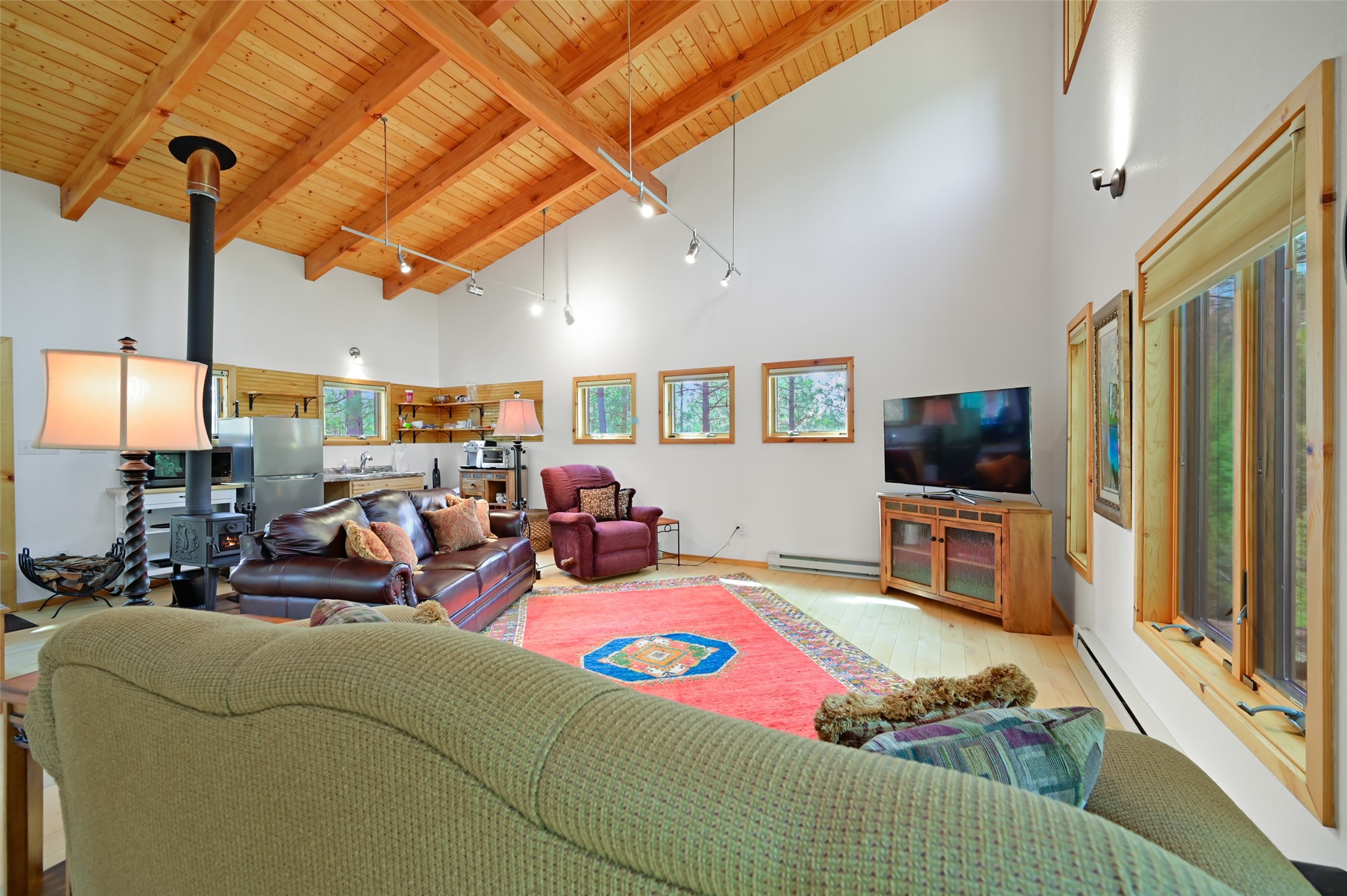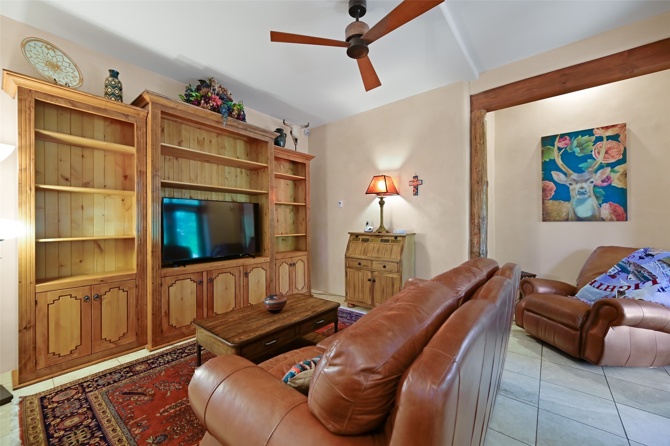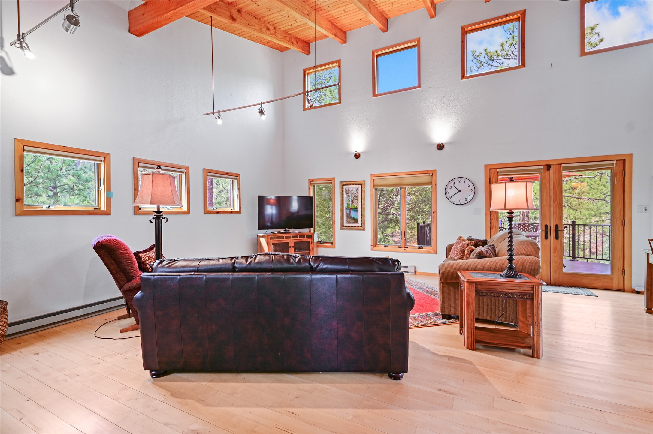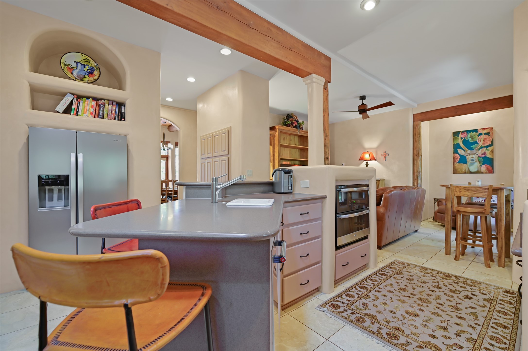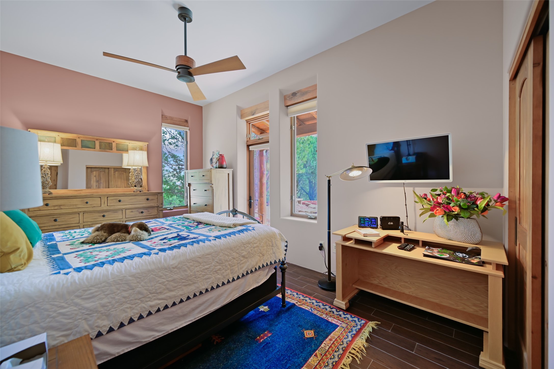 Life is beautifully slow at this elegant retreat set on 27+ acres, adjacent to the Santa Fe National Forest. Tucked in a quiet canyon, the main home features a great room with a stone kiva fireplace, a cozy den off the kitchen, dining room, two bedrooms and bath, 1/2 bath and a large utility room area with abundance of storage. The primary suite located on the upper floor of this home offers an additional living area, wood floors, kiva fireplace and a spa-like bathroom with a steam shower, plus a generous deck perfect for enjoying expansive skies both night and day - truly a luxurious treetop perch. The rear of the main home opens to a grand portal - an expansive outdoor living area with plenty of room for entertaining, dining or just relaxing. The kiva fireplace in this roomy portal ensures warmth and cozy ambiance through the various seasons, extending comfortable year-round living to the outdoors. The guest house is a large yet snug, comfortable and warm space for your guests. The rear of this space opens to a deck overlooking the forest creating a wonderful experience for family and friends. The interior has a kitchenette and wood stove enhancing the livability of this great space. This property is located at the end of the trail/road and entry to the property is through a custom gate.