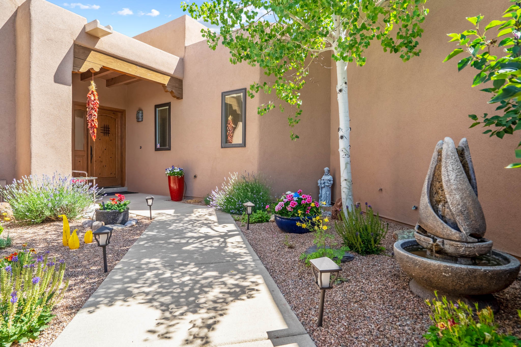 The northwest of Santa Fe within city limits includes one of the most affordable, family areas – Casa Solana. With beautiful mature trees, sidewalks and paved streets, Casa Solana has a real neighborhood atmosphere. Gonzales Elementary is within walking distance to all and the Casa Solana shopping area is a treat. The homes were built in the 1960’s by developer Allen Stamm and all include vigas, hardwood floors, fireplaces and solid construction. As you travel down West Alameda , the homes begin to spread out a bit. Horse farms dot the landscape. Newly-constructed homes appear on large open tracts. Any left hand turn takes you down to the Santa Fe River and any right hand turn delivered you into the hills above Santa Fe. Some lots in the hills offer 360 degree views, some a beautiful view of the Santa Fe city lights. Includes Zocolo and Santa Fe Estates.